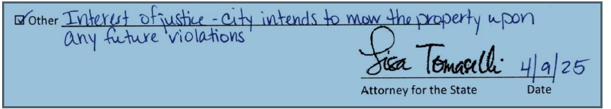 From a list of standard dismissal reasons—no witness, not enough evidence, “the defendant has remedied the nuisance that is the subject of this offense”—the prosecutor checked “Other.” And then she wrote: “Interest of justice – city intends to mow the property upon any further violations.”